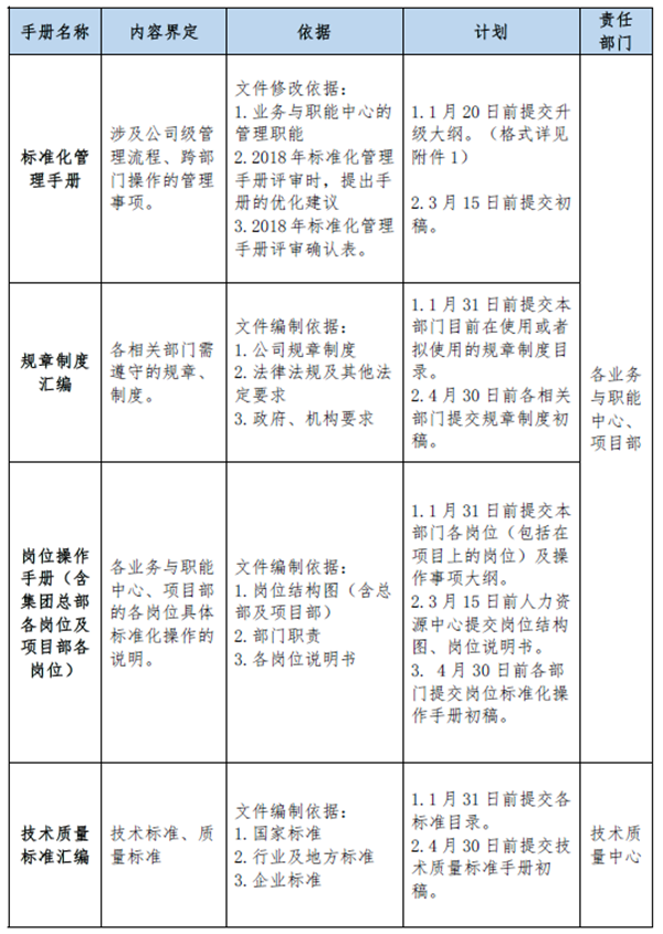 1. 標(biāo)準(zhǔn)化管理手冊(cè)編制大綱是以手冊(cè)管理事項(xiàng)為單位,各 部門(mén)依據(jù)管理職能、評(píng)審時(shí)的優(yōu)化建議以及所簽署的《2018 年標(biāo)準(zhǔn)化管理手冊(cè)評(píng)審確認(rèn)表》中相關(guān)整改措施,按附件 1