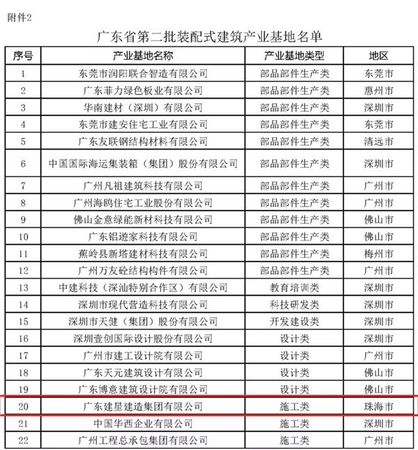 近期,廣東省住房和城鄉(xiāng)建設(shè)廳開展了廣東省第二批裝配式建筑示范城市、產(chǎn)業(yè)基地和示范項(xiàng)目的申報(bào)工作。經(jīng)專家評(píng)審,建星集團(tuán)成為珠海市唯一一個(gè)獲得裝配式建筑產(chǎn)業(yè)基地項(xiàng)目的施工單位。