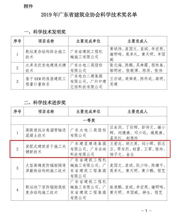 同期,我司積極參與廣東省建筑業(yè)協(xié)會(huì)首屆科學(xué)技術(shù)獎(jiǎng)申報(bào)。根據(jù)評(píng)審規(guī)則,在經(jīng)過形式審查、專業(yè)評(píng)審、評(píng)委會(huì)審定、公示、公布等程序后,我司的“裝配式建筑若干施工關(guān)鍵新技術(shù)”在112項(xiàng)申報(bào)材料中脫穎而出,獲得科學(xué)技術(shù)進(jìn)步一等獎(jiǎng),由主要完成人參加了現(xiàn)場(chǎng)的答辯,獲得了專家的一致好評(píng)。