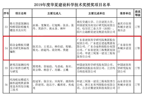 近日,華夏建設(shè)科學(xué)技術(shù)獎勵委員會公布“2019年度華夏建設(shè)科學(xué)技術(shù)獎“獲獎名單,建星集團參與完成的科研項目《鋁合金模板關(guān)鍵技術(shù)研究和標(biāo)準編制》獲2019年度華夏建設(shè)科學(xué)技術(shù)獎三等獎。